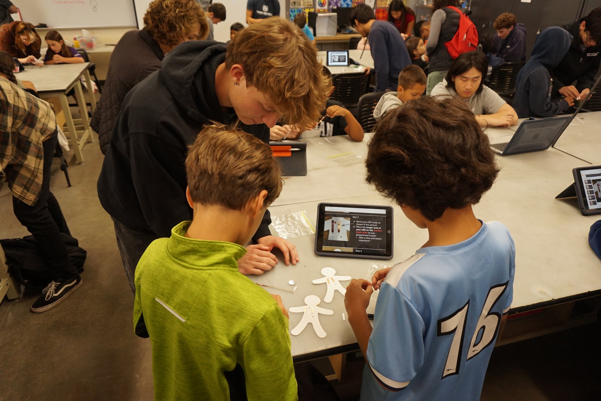 These include interacting with original exhibits and providing user feedback to 12th grade exhibit designers, learning how to make parts on industrial machinery from DPEA 10th and 11th graders, and using electronics and coding to create art projects with LEDs.